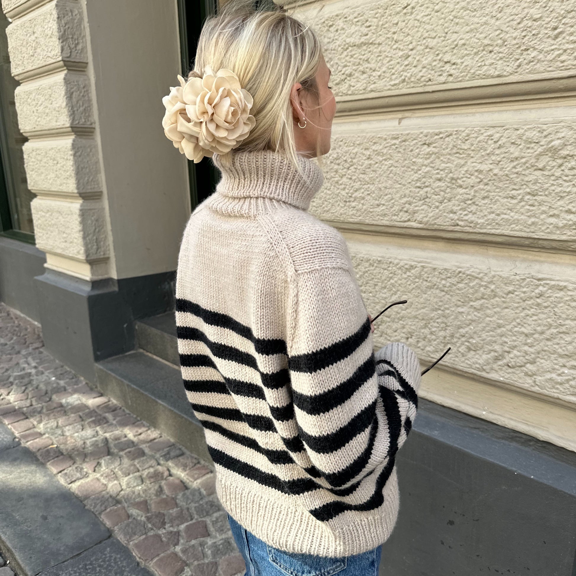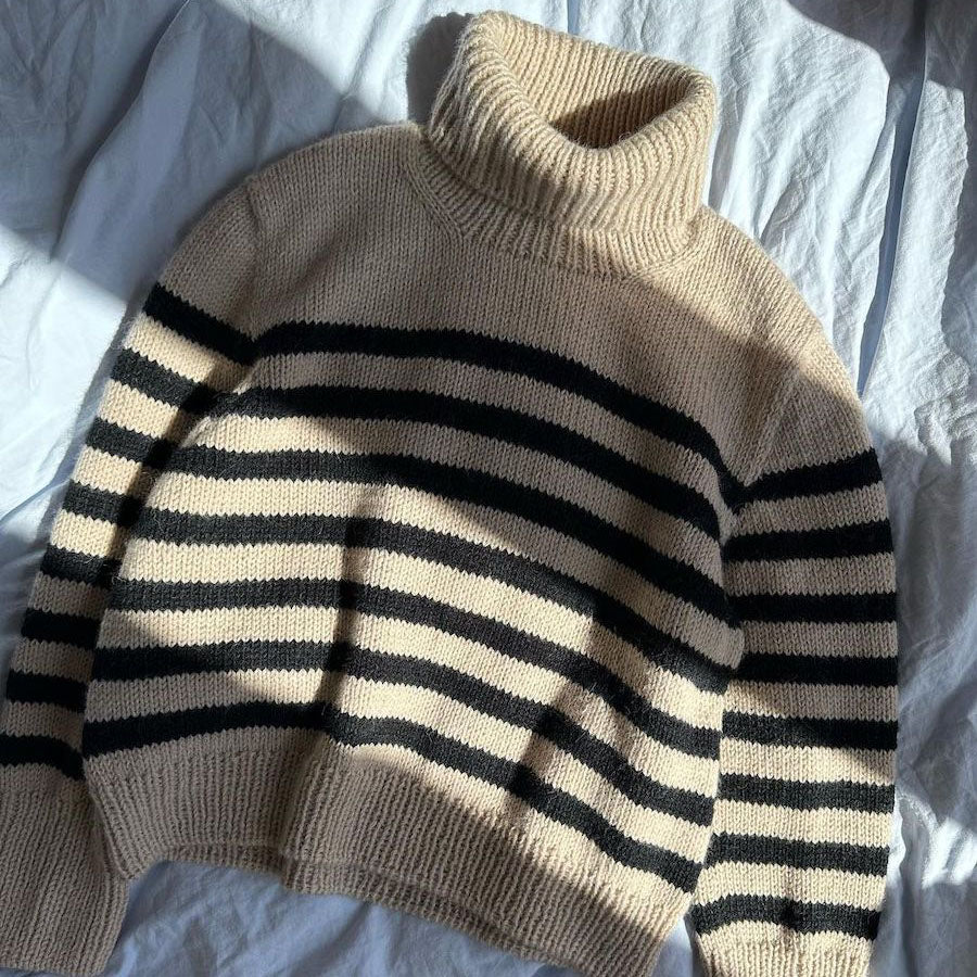 Il Lyon Sweater CHUNKY EDITION si lavora dall'alto verso il basso. Prima si lavora la parte superiore del dietro con gli aumenti. Poi si lavorano le spalle dalle maglie riprese lungo la parte superior del dietro. Le maglie verranno riprese lungo le spalle, e il resto dello sprone verrà lavorato sui ferri circolari, prima avanti e indietro e poi in tondo. Il corpo è lavorato in tondo sui ferri circolari e le maniche sono lavorate in tondo sui ferri a doppia punta o sui ferri circolari con la tecnica Magic Loop. Alla fine si lavora il collo dolcevita a coste. Il maglione è lavorato a righe dal centro dello sprone fino alla fine.