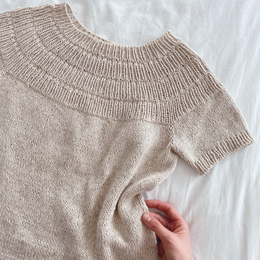 Anker’s Summer Shirt è lavorata dall'alto verso il basso. Lo sprone è composto da segmenti a coste con aumenti in tondo, seguiti da aumenti raglan classici. Il corpo viene lavorato in tondo a maglia rasata. Infine vengono realizzate le maniche con i ferri a doppia punta o con la tecnica Magic Loop. Anker’s Summer Shirt non richiede ulteriore confezione.