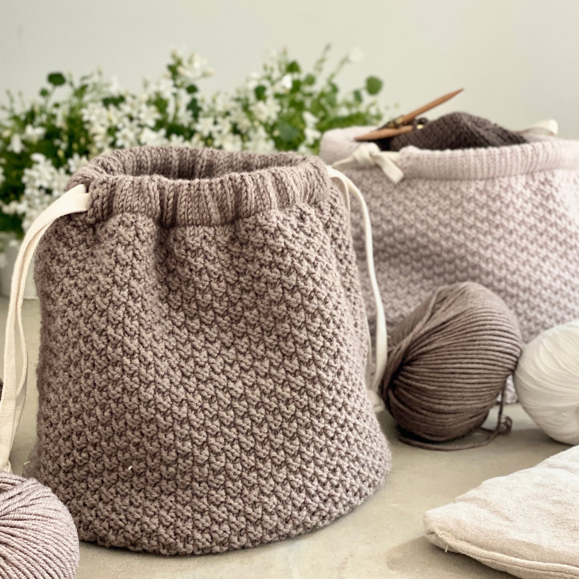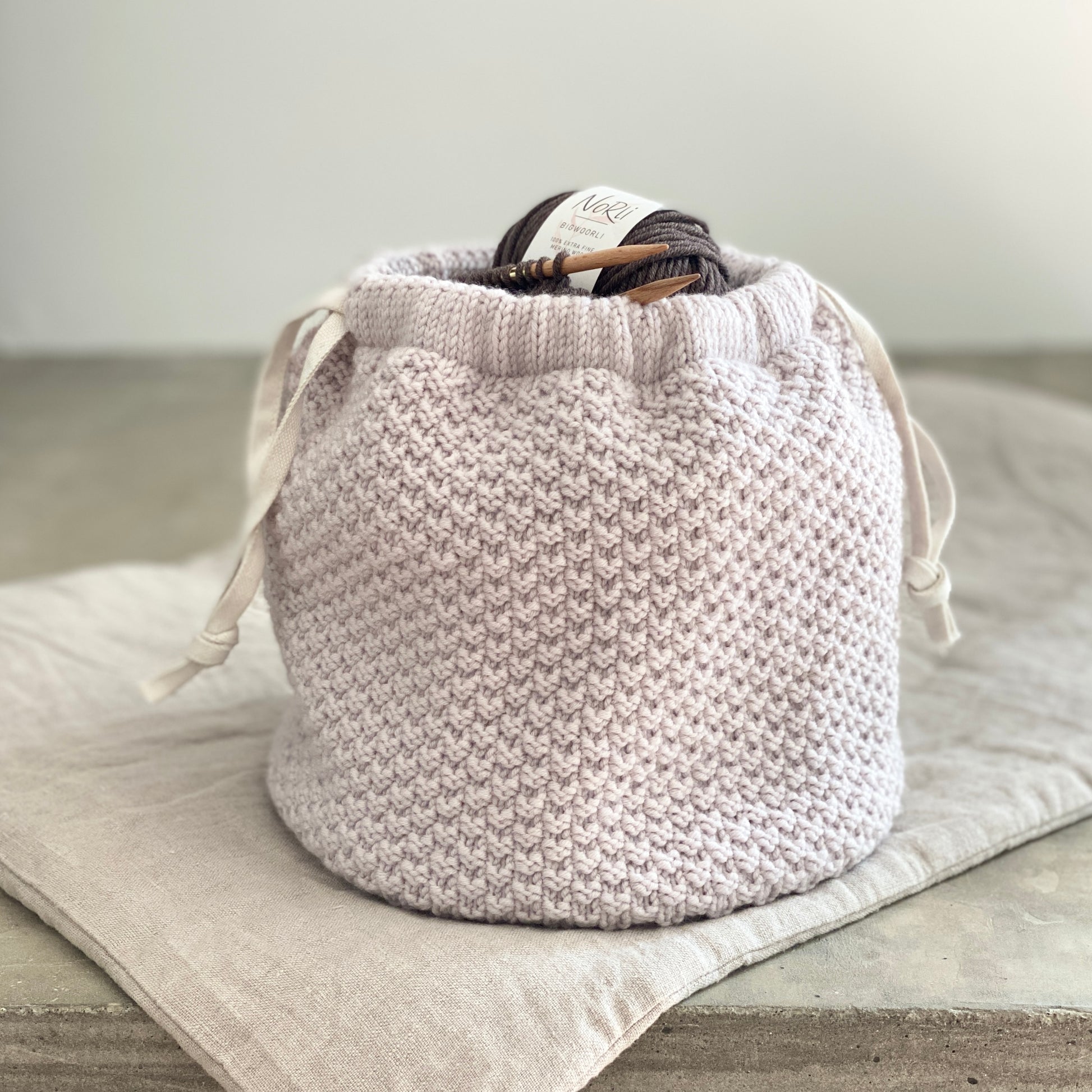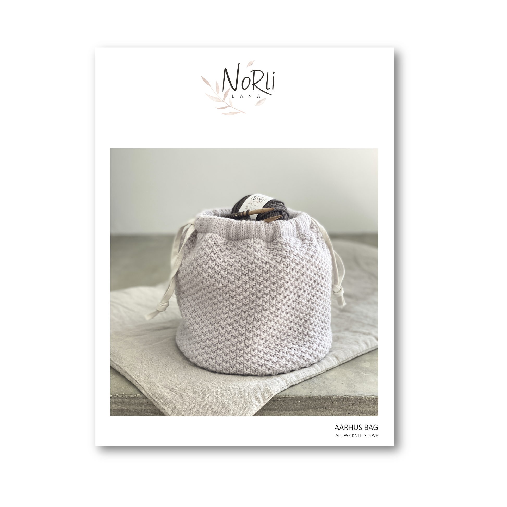 Aarhus Bag è lavorata dal basso verso l'alto. Il fondo è piatto e si lavora in tondo con la tecnica Magic Loop (o con i ferri a doppia punta). I lati della borsa vengono lavorati in tondo con i ferri circolari a grana di riso doppia che è uno dei motivi strutturati più belli ma anche incredibilmente facile da lavorare. Al termine si lavora un bordo a maglia rasata, successivamente ripiegato per creare la coulisse per il cordoncino.