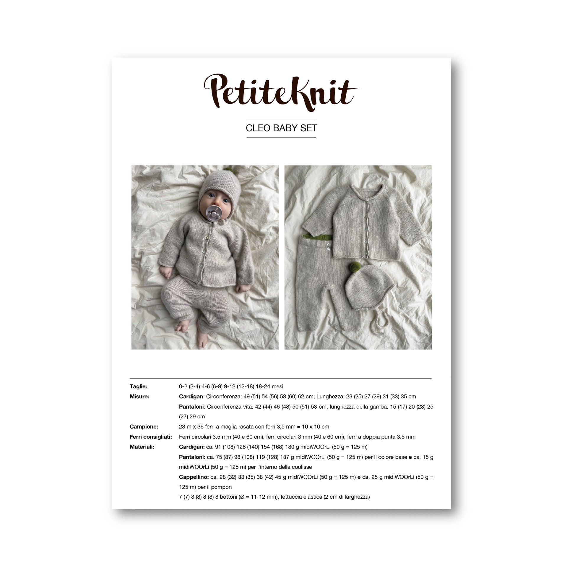 PATTERN stampato del modello Cleo Baby Set di PetiteKnit. Questo pattern, tradotto in italiano e stampato in esclusiva Norli su carta di alta qualità, ti verrà inviato per posta.