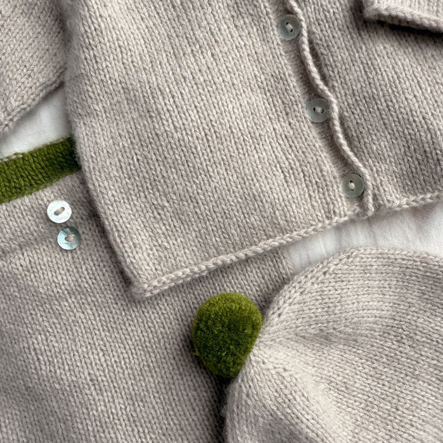 Cleo Baby Set è composto da cappellino, cardigan e pantaloni.
