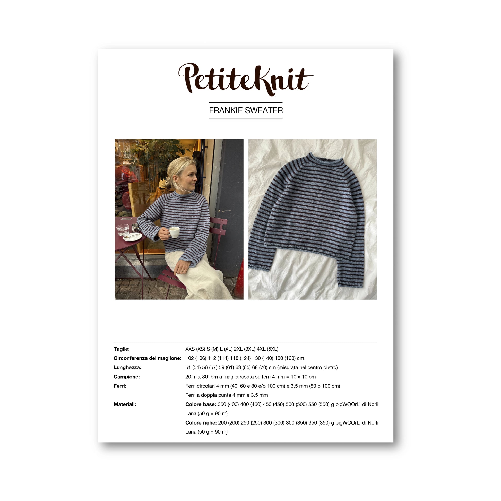 Questo KIT comprende il libretto di istruzioni in ITALIANO di FRANKIE SWEATER by PetiteKnit insieme al tuo FILATO NORLI preferito.