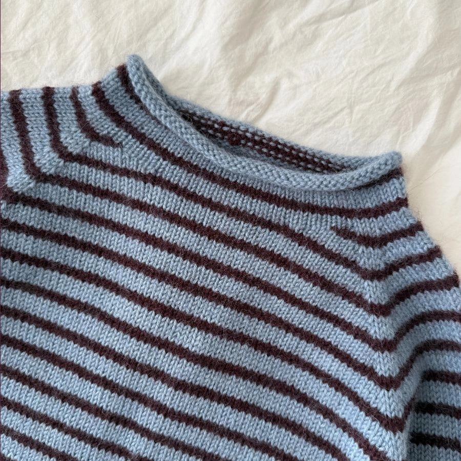 Frankie Sweater si lavora dall'alto verso il basso con aumenti raglan sullo sprone. Si lavorano i ferri accorciati lungo la parte posteriore del collo per modellare la scollatura. Le maniche si lavorano in tondo con ferri a doppia punta o circolari. Frankie Sweater si lavora a righe sottili.