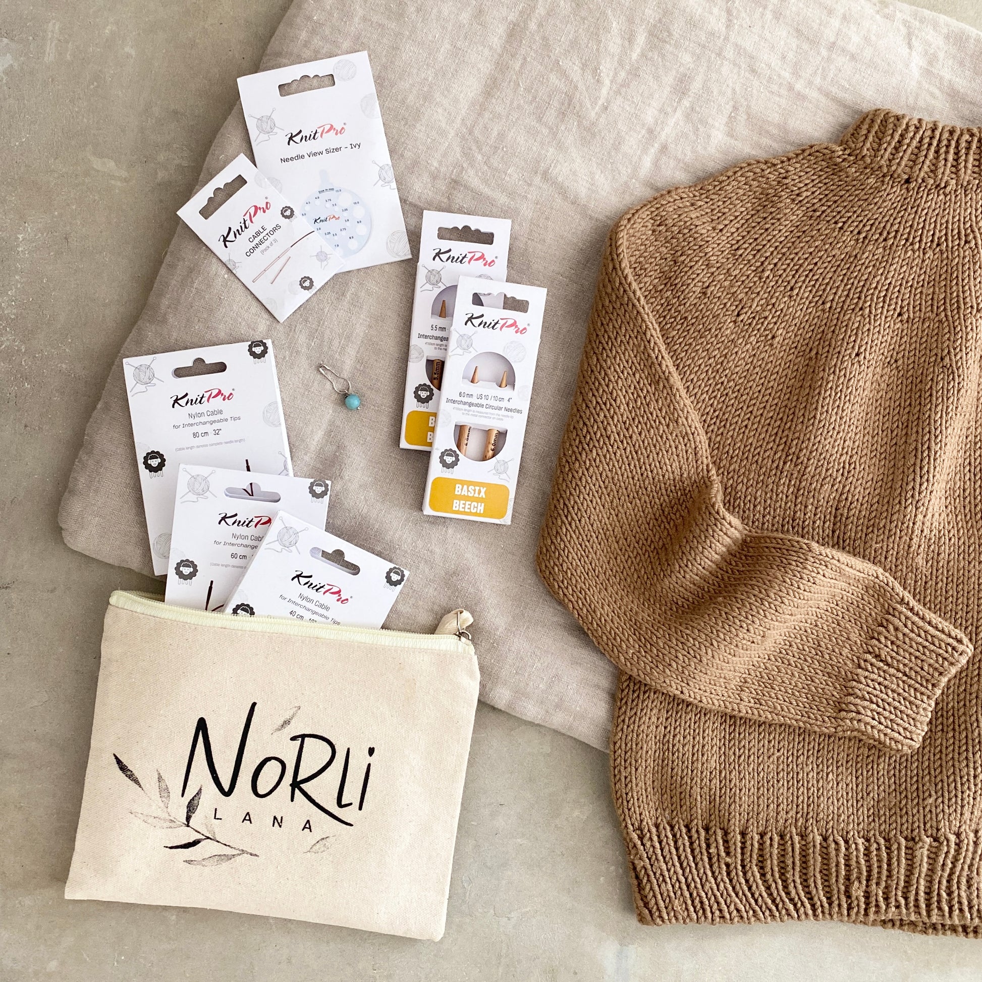 All'interno di questo set troverai tutti gli accessori necessari per entrare nel mondo del lavoro a maglia con i ferri circolari e lavorare il tuo NOVICE SWEATER.