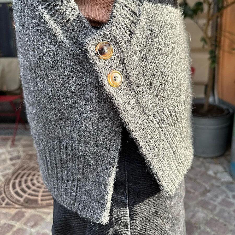 Lulu Slipover è un gilet con un profondo giromanica, chiuso ai lati con due bottoni. Si lavora dall'alto verso il basso. Si comincia lavorando il dietro e poi il davanti. L'apertura delle maniche viene rifinita con bordi a coste, mentre gli spacchi laterali sono lavorati con bordi a maglia rasata doppia. Nella parte anteriore di questi bordi a maglia rasata doppia vengono realizzate due asole. Infine, il collo è rifinito con un bordo a coste.