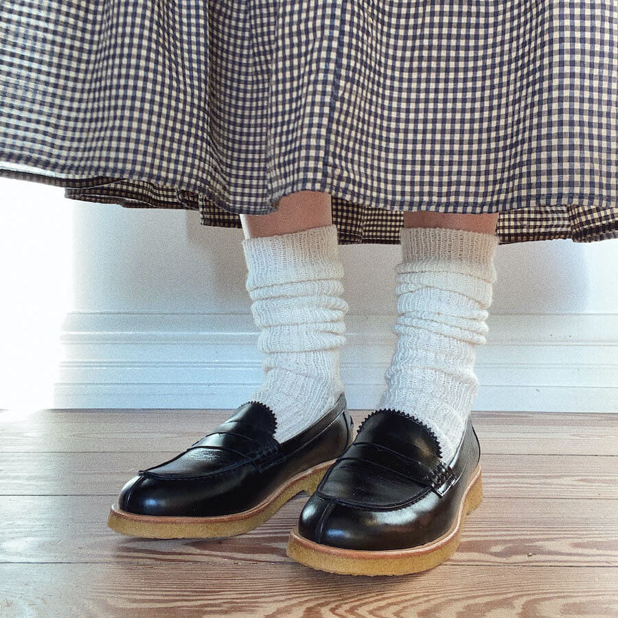 Le Penny Sock sono lavorate dall'alto verso il basso, dalla gamba alla punta. Le calze sono lavorate a coste (1 dir, 1 rov) sulla gamba e sul sopra del piede e a maglia rasata sul tallone e sul sotto del piede. Le Penny Sock sono lunghe e progettate per essere leggermente cascanti sulla caviglia.