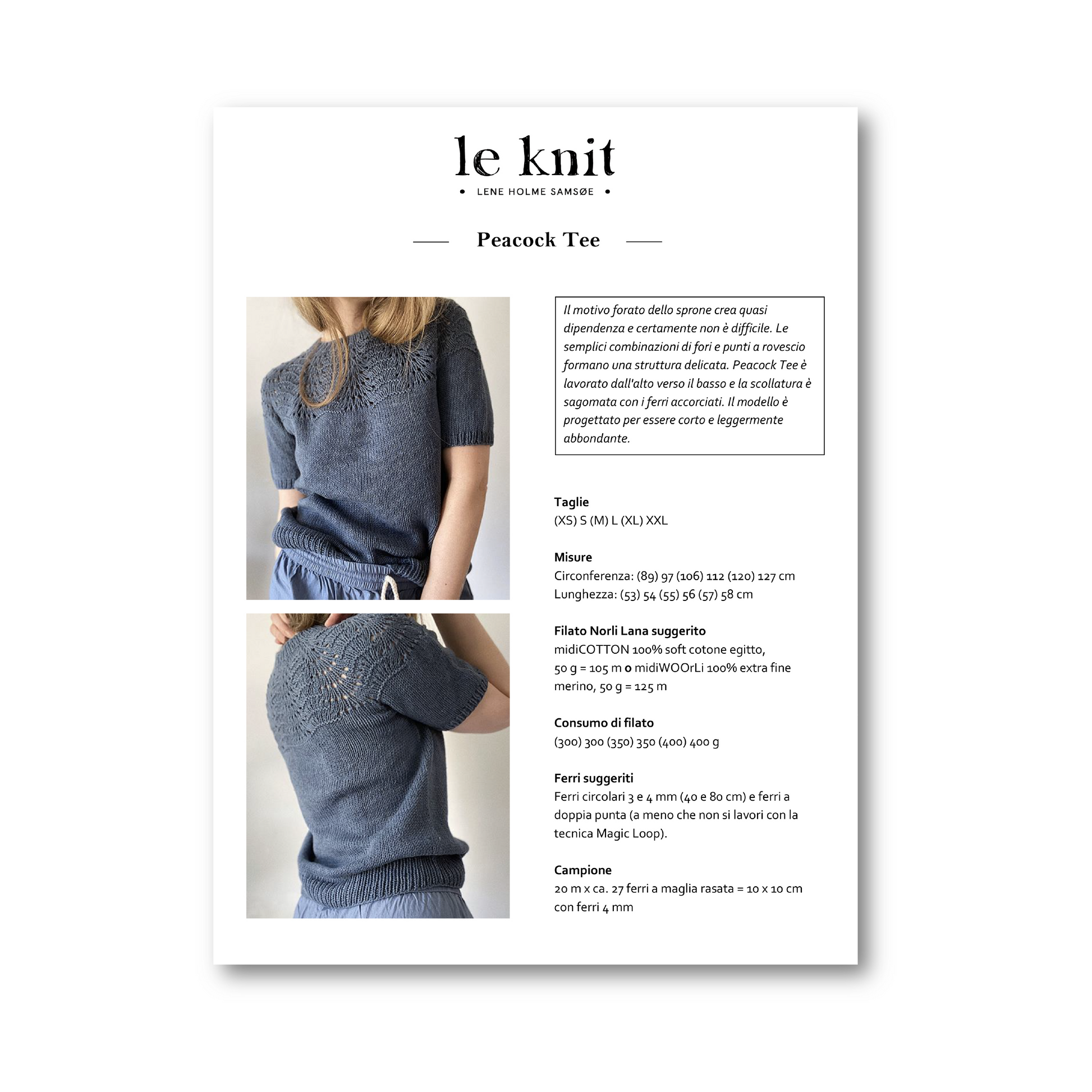 Questo KIT comprende, in esclusiva, le istruzioni in ITALIANO di PEACOCK TEE insieme al tuo FILATO NORLI preferito. Scegli la tua taglia e il colore e riceverai a casa sia il pattern stampato che il filato che hai scelto per la sua esecuzione.